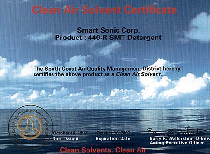 Smart Sonic's 440-R SMT Detergent is certified as a "Clean Air Solvent" by the South Coast Air Quality Management District CAS Program.