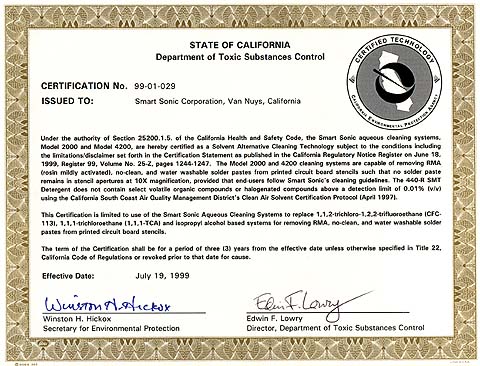 In 1998, Smart Sonic submitted its Stencil Cleaning Process to the U.S. Environmental Protection Agency and the California Environmental Protection Agency for the thorough evaluation. A representative automatic stencil cleaner (Model 4200) and a representative manual stencil cleaner (Model 2000) were evaluated using Smart Sonic's non-hazardous 440-R SMT Detergent.