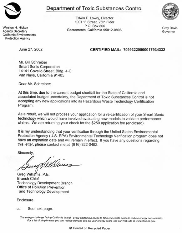 While the California EPA Certification data is valid for a period of three years, the U.S. EPA Verification of that data is permanent and does not expire (see letter from the Cal/EPA DTSC below). Recertification of the California EPA data would be important and necessary only if the overall process has changed or a different chemistry was used.